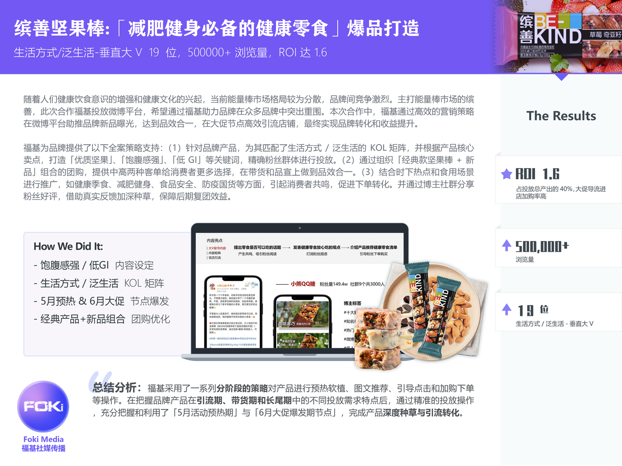 随着人们健康饮食意识的增强和健康文化的兴起,当前能量棒市场格局较为分散,品牌间竞争激烈。主打能量棒市场的缤善,此次合作福基投放微博平台,希望通过福基助力品牌在众多品牌中突出重围。