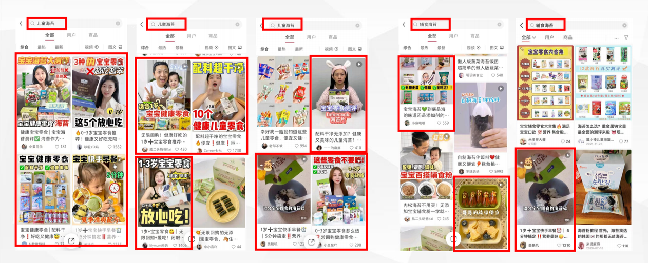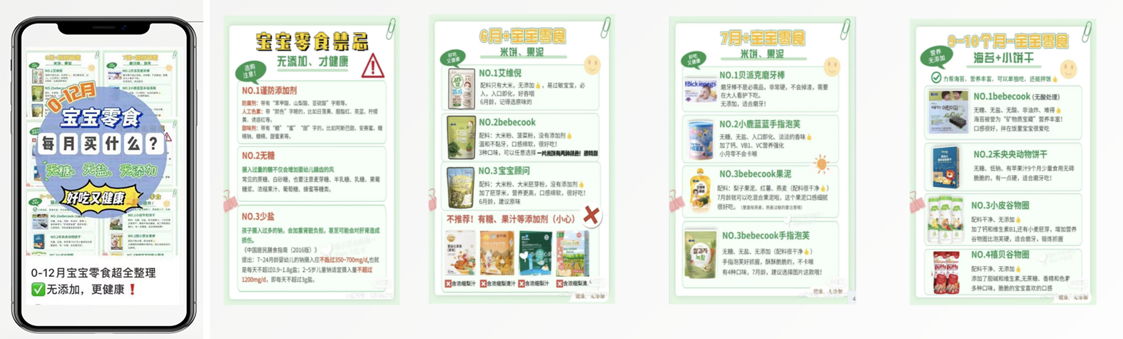 在洞察品牌产品核心为「安心」及宝妈人群在「儿童辅食」选购中具有「不同月龄」、「宝宝挑食」的潜在需求或问题的基础上,平台发布的内容笔记多从 Vlog 日常辅食场景、辅食饭团教程、儿童零食推荐等引出 bebecook 海苔,从不同月龄儿童零食推荐引出好物bebecook 各品类,实现针对不同月龄的精准的 content 设定。