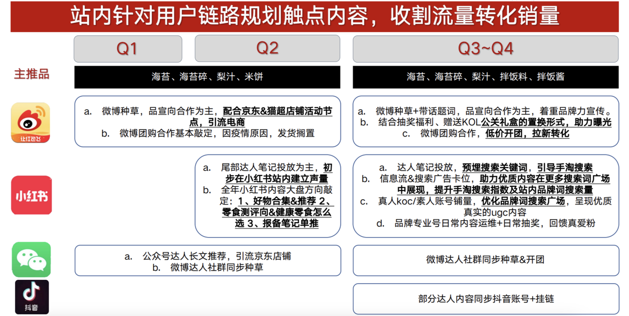 bebecook 的季度新品为「黄金芝麻海苔」、「拌饭料」,主推品为「海苔片/海苔碎」、「桔梗梨汁」,福基通过擅长的母婴领域关键词爆发(KEY WORDS POP),紧贴社交平台增长热点,发挥内容运营的价值及特有的红人矩阵组合的优势,精准触达宝妈人群,完成辅食产品的有效种草,实现了电商引流+效果转化双赢。