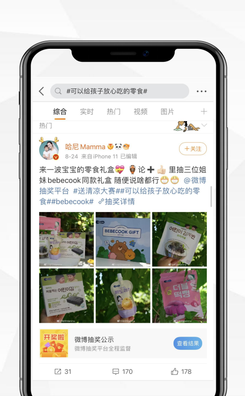 ·社群引流&晒单——随手po扩大声量 开启转发抽奖活动,配合新浪抽奖流商业扶持、微博达人社群种草&开团、自创话题「#可以给孩子放心吃的零食」等,强化产品「安心」标签,多维度助攻引流,进一步扩大了品牌的声量,丰富了品牌广场内容纬度。加上粉丝多会自发性返图的特点,平台优质的ugc内容也得此不断积累,形成积极可循环的正向反馈效果。