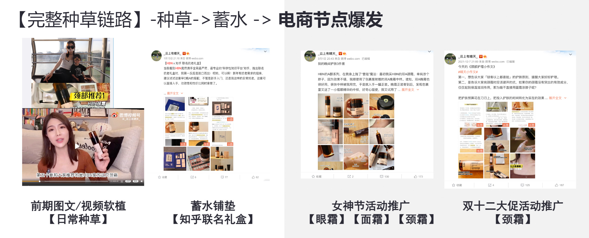 福基根据HBN品牌特性,在投放种草过程中紧紧把握HBN的核心科技,面向用户科普「早C晚A」、「视黄醇」护肤概念,提升用户对品牌的认知。通过头部成分党KOL进行科学背书,强调品牌的科研技术,打造品牌独特竞争优势。在投放过程中,准确把控节点,反复触达精准人群,打造忠粉群体,并在后期实现精准收割,实现有效转化。