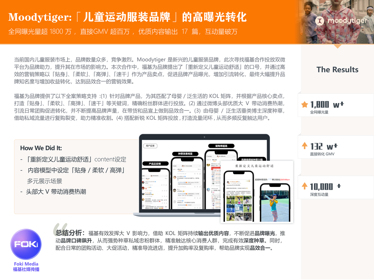 当前国内儿童服装市场上,品牌数量众多,竞争激烈。Moodytiger 是新兴的儿童服装品牌,此次寻找福基合作投放双微平台为品牌助力,提升其在市场的影响力。