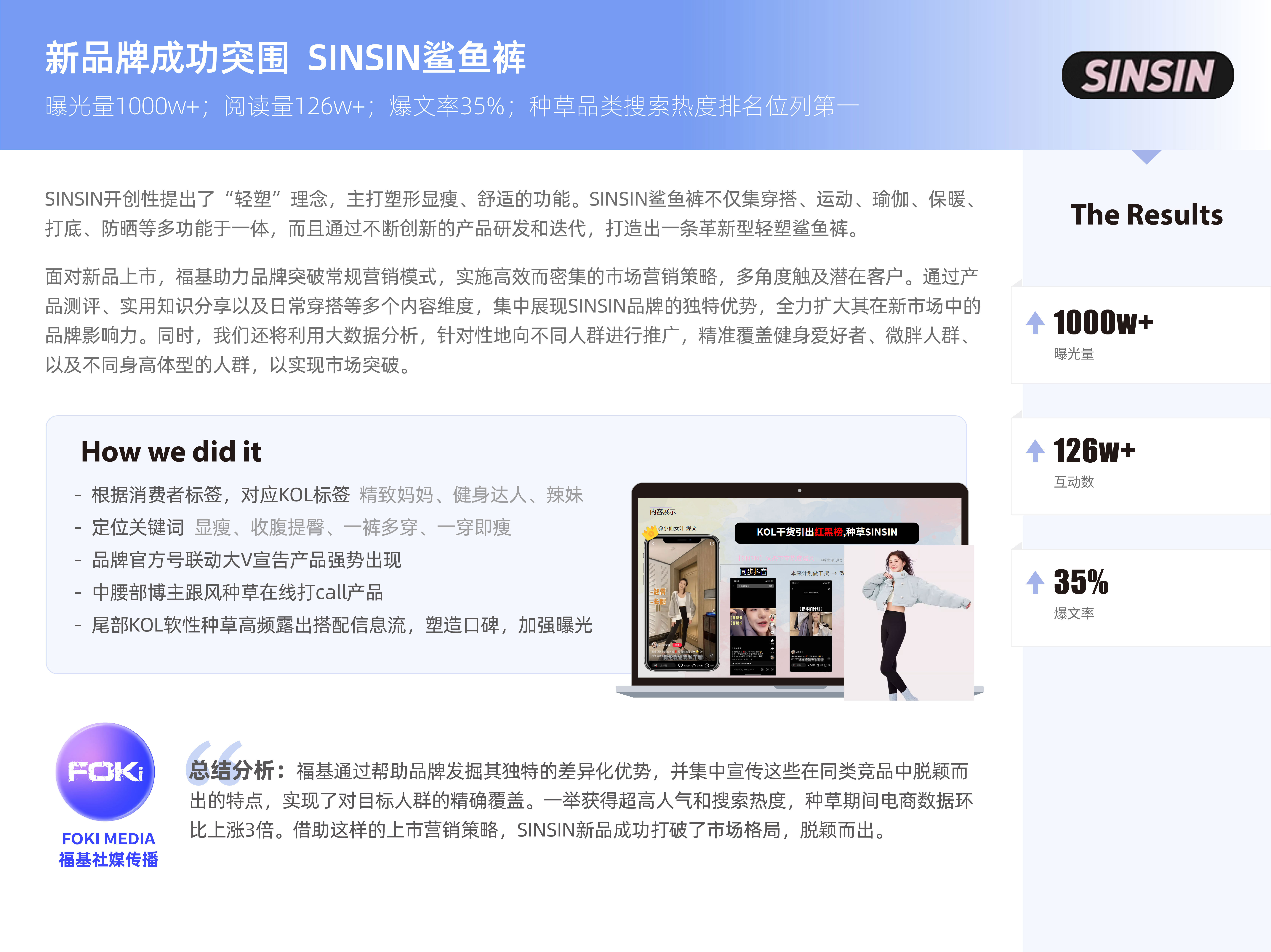 面对新品上市,福基助力品牌突破常规营销模式,实施高效而密集的市场营销策略,多角度触及潜在客户。通过产品测评、实用知识分享以及日常穿搭等多个内容维度,集中展现SINSIN品牌的独特优势