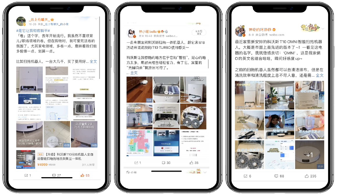 营销活动中,福基还为科沃斯打造了「说一声就干净」、「扫拖一体,一步到位」等直击消费人群痛点的口号。并从功能展现、场景种草、生活分享三个维度出发,打造多维度的内容矩阵,使「卷」 渗透在用户日常场景中的方方面面。针对目标人群的精准的 content 设定让智能化、自清洁、便捷省心的产品特点深入人心,奠定了品牌产品口碑,并实现圈层引爆,强力促成转化。